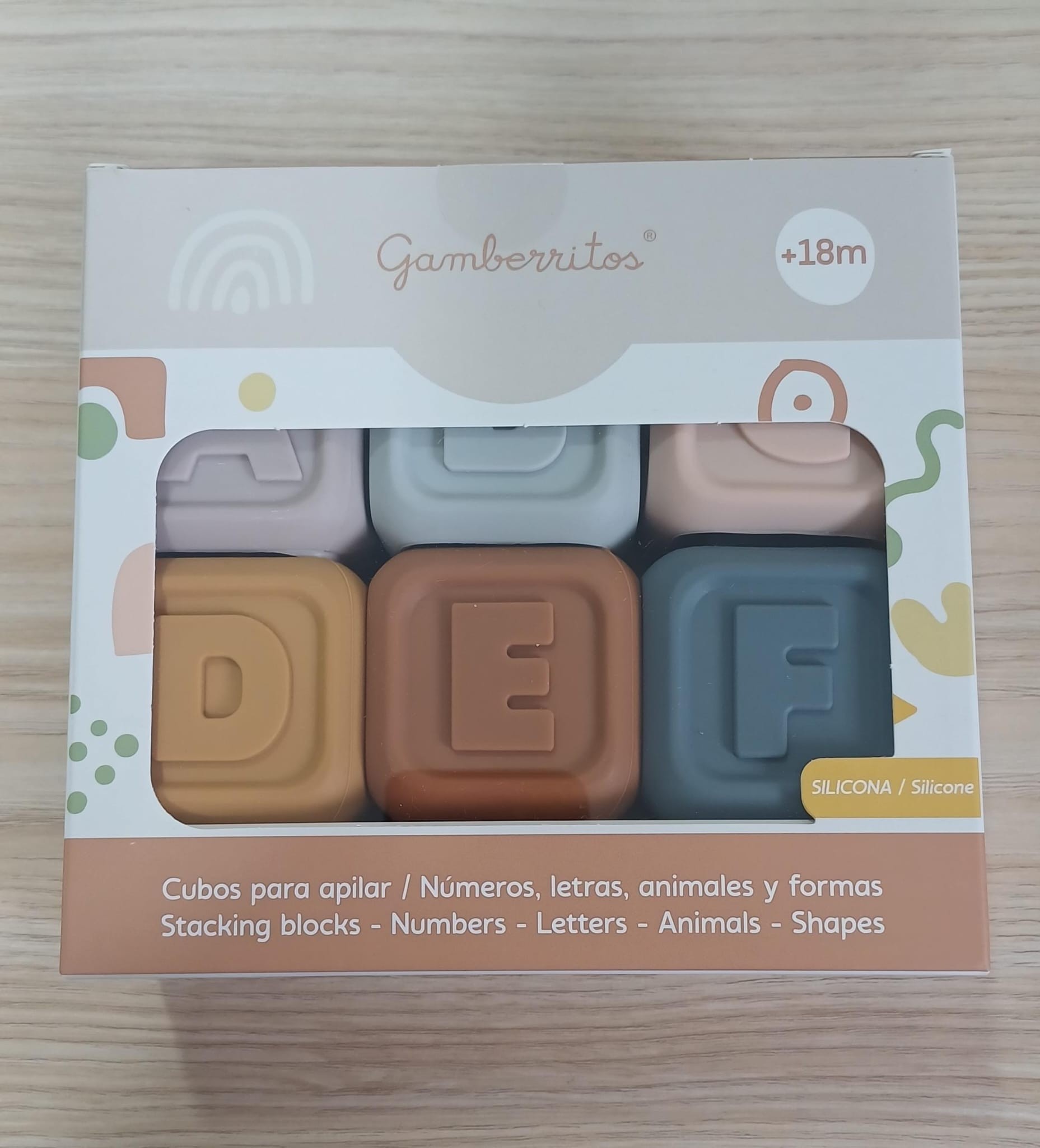 Juguete apilable de silicona forma de cubo con letras, números, animales y formas