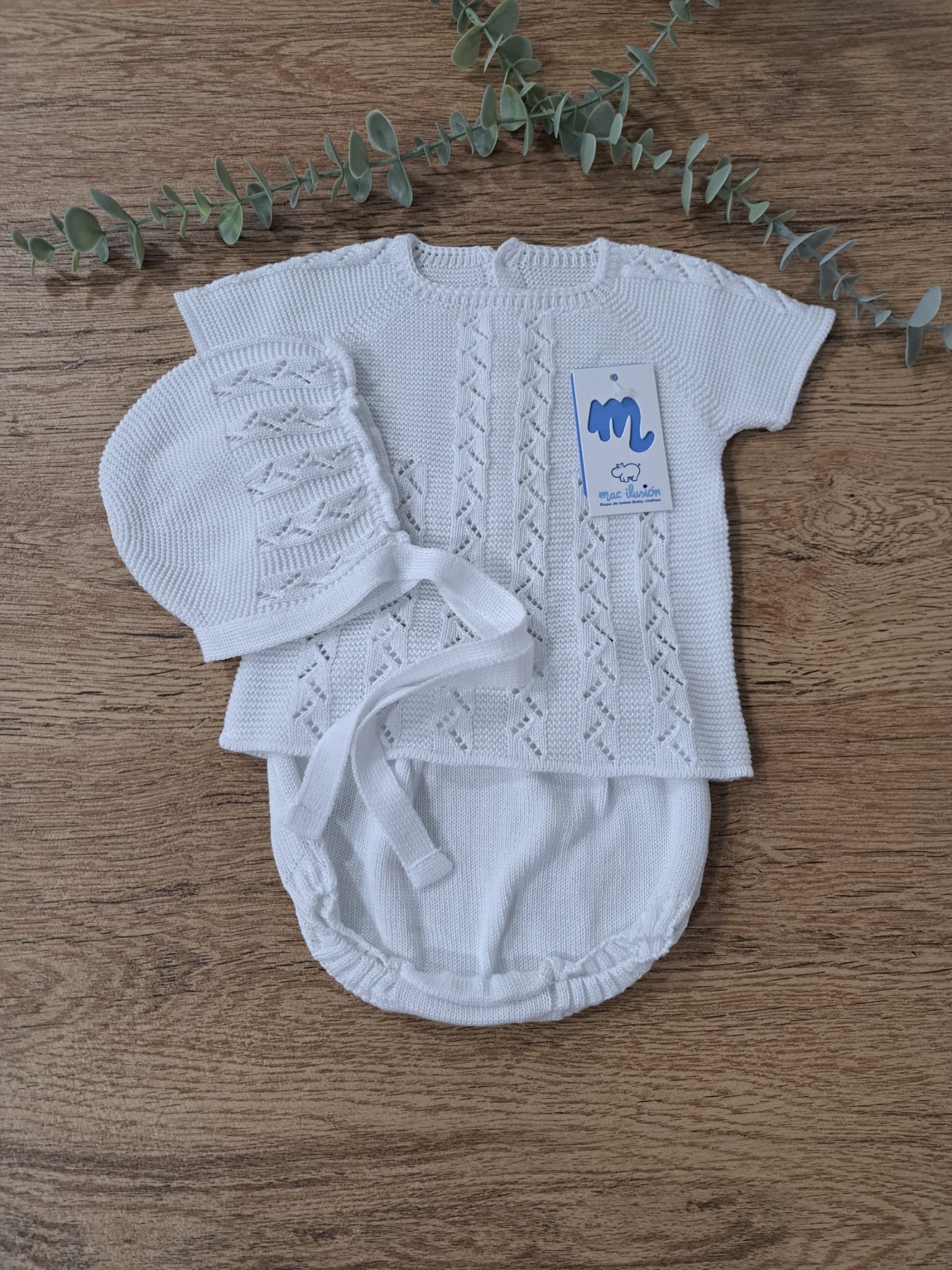 Conjunto de hilo blanco tres piezas. Compuesto por capota, jersey mangas cortas y braguitas