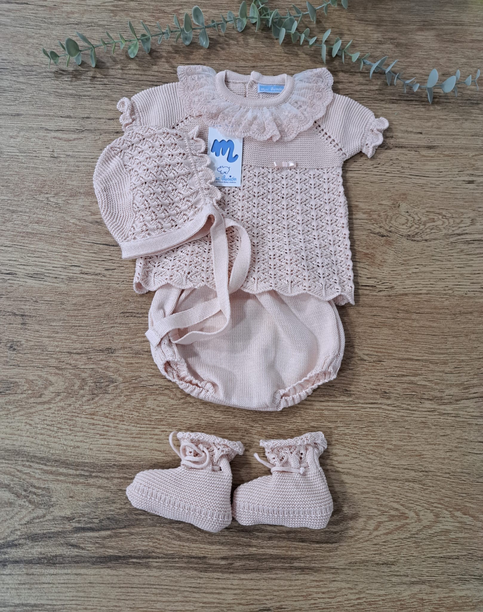 Conjunto de hilo rosa. Compuesto por capota, jersey de mangas cortas, braguita y patucos