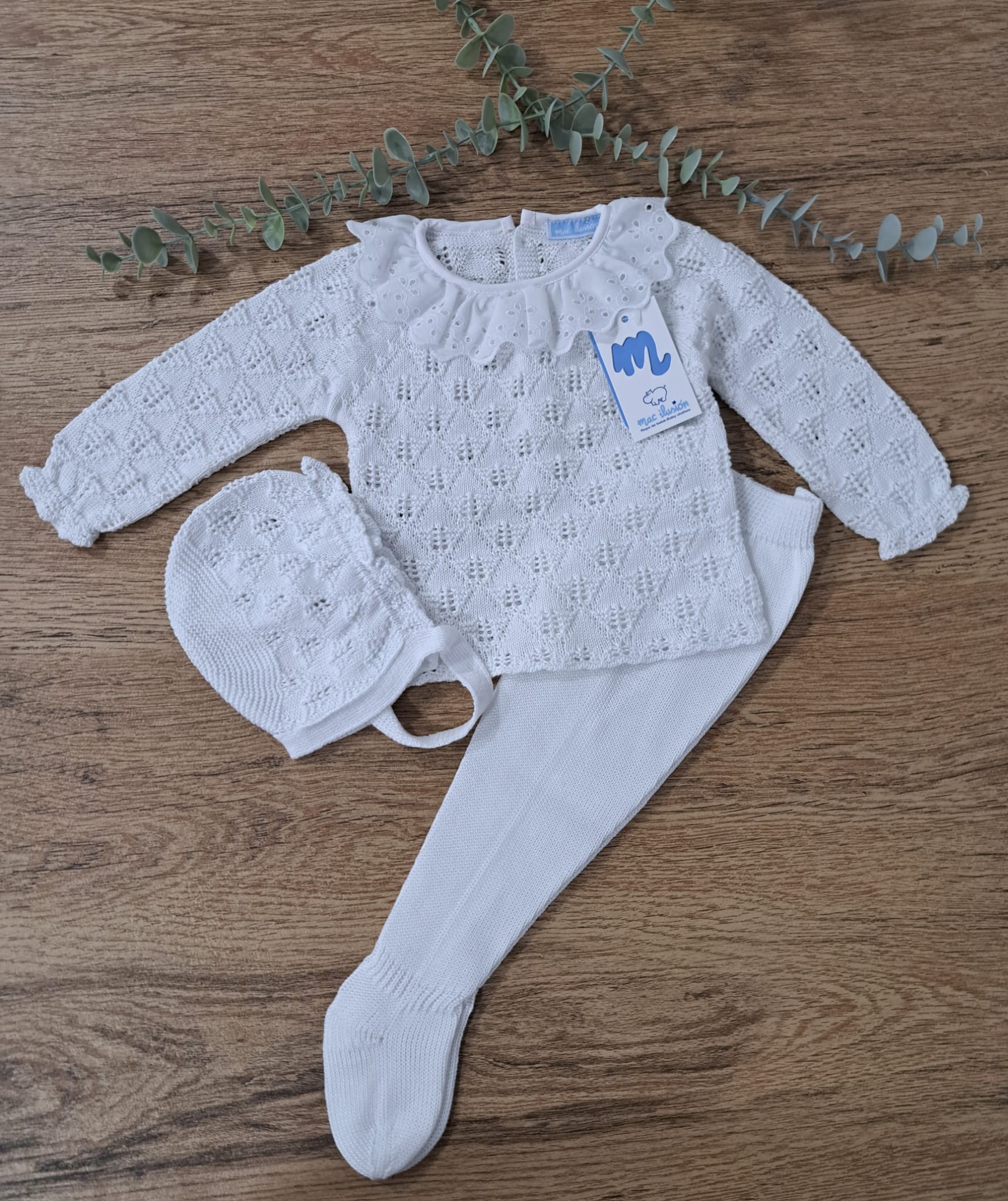 Conjunto polaina de hilo blanco. Compuesto por capota, jersey de mangas largas y polainas