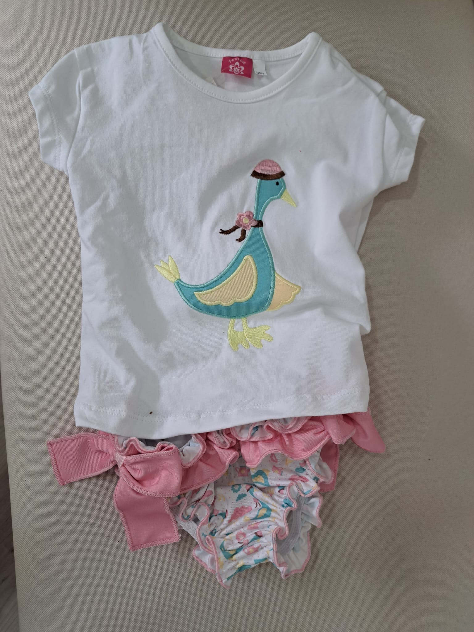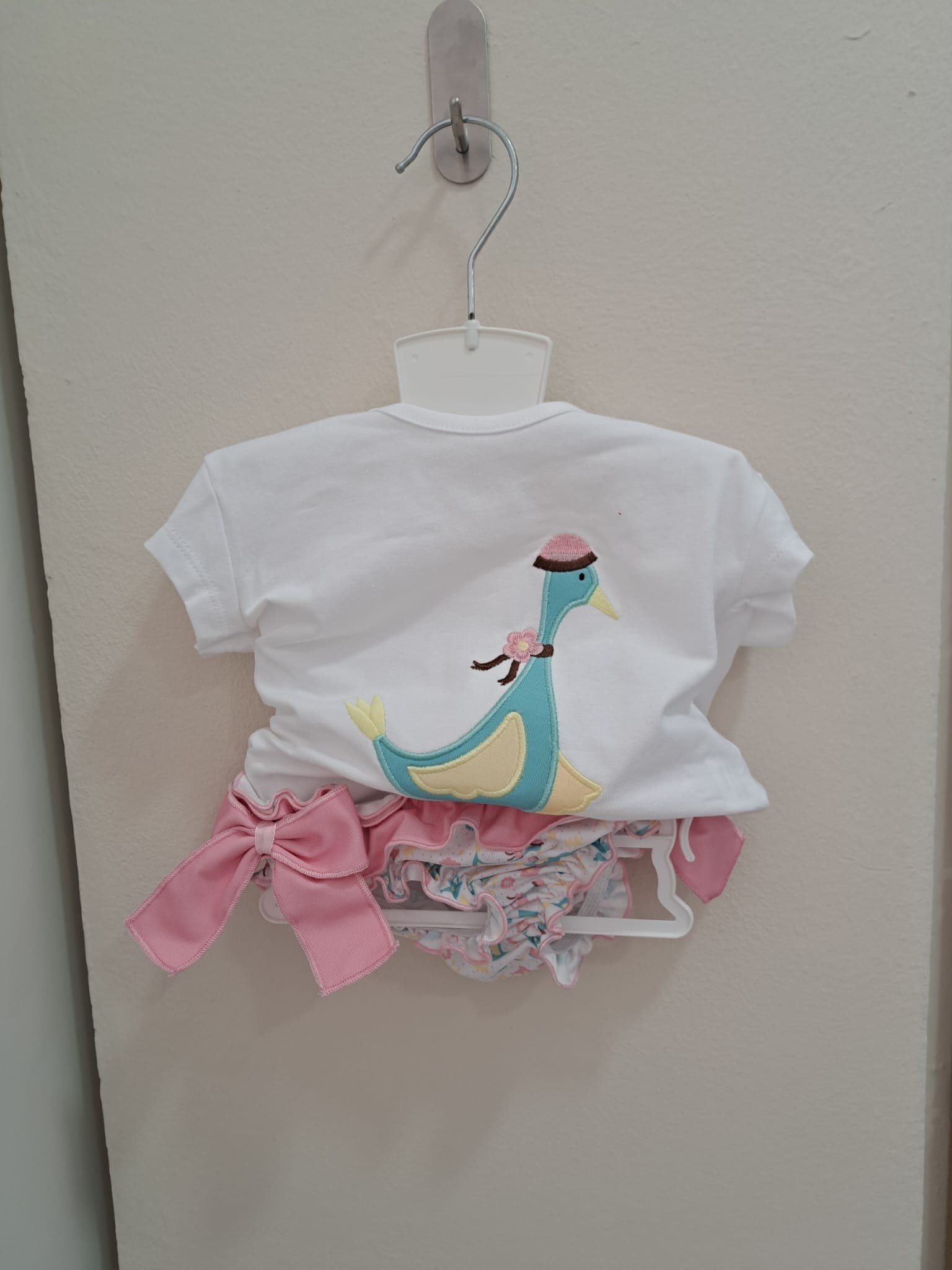 Conjunto baño niña pato gorro, con volante y lazos en braguita
